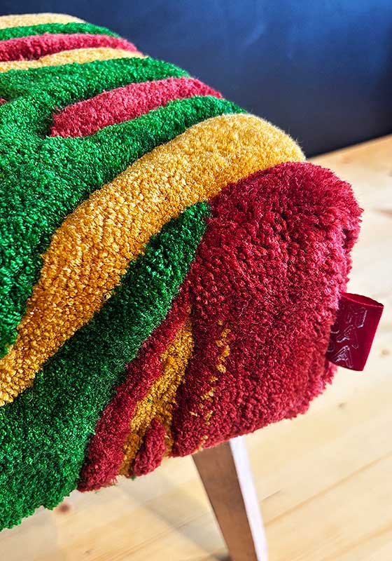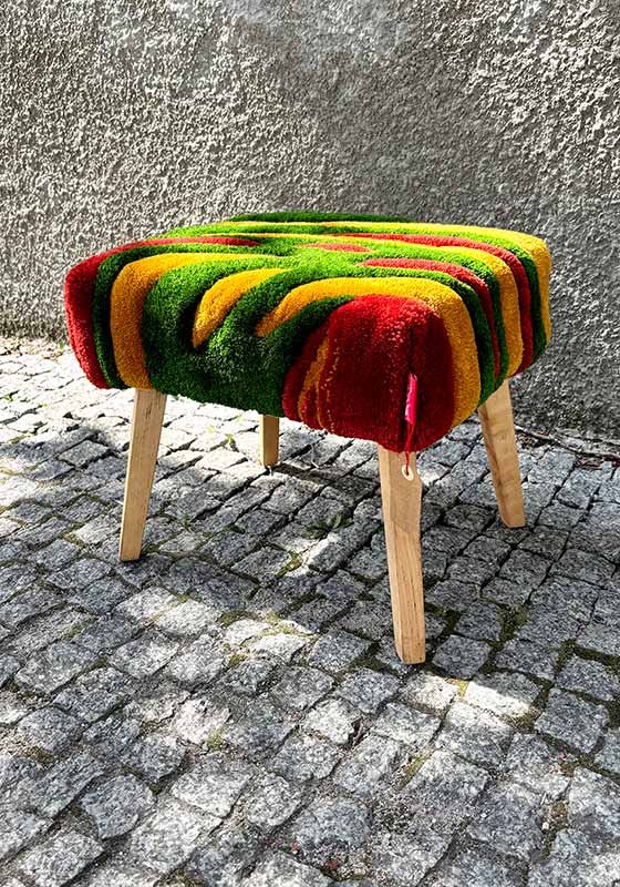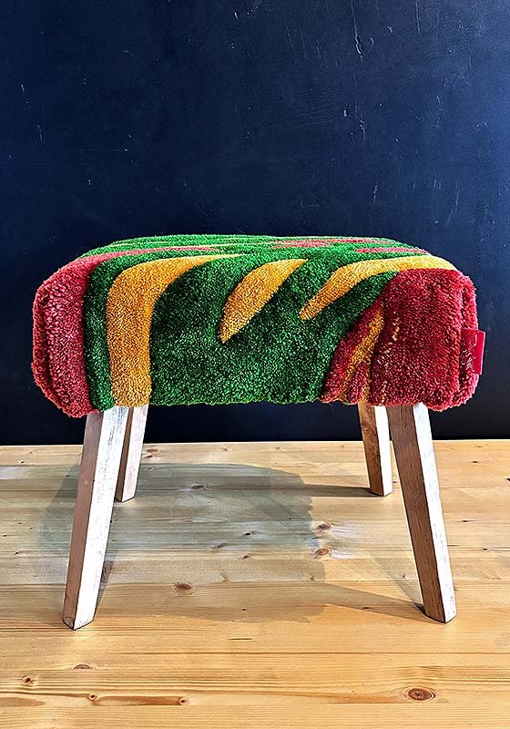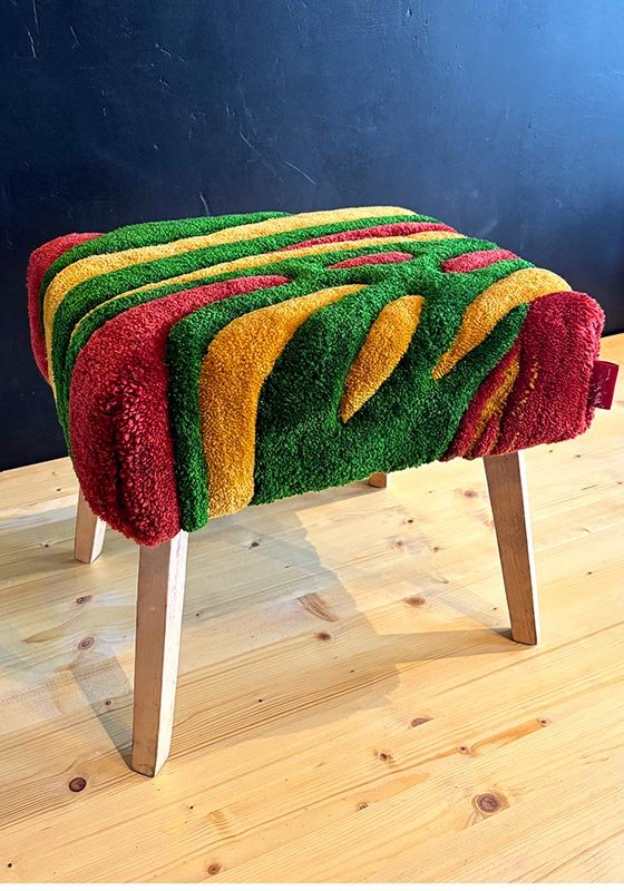 Šis pufas yra restauruotas, medinės detalės originalios, nušlifuotos ir naujai nulakuotos, išlaikytas baldo autentiškumas ir klasikinė forma. Visiškai pakeistos visos vidinės ir išorinės minkštosios dalies detalės, gobelenas sukurtas rankomis taftingo būdu iš vilnonių ir akrilinių siūlų. Audinys minkštas, tankus ir ilgaamžis, gobelenas iškarpytas skirtingais aukščiais, tai sukuria malonų daugiasluoksniškumą, baldas iš skirtingų pusių atrodo vis kitaip.
