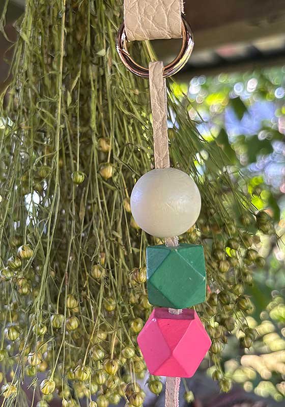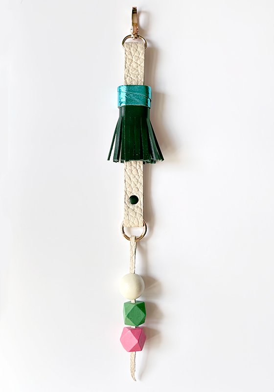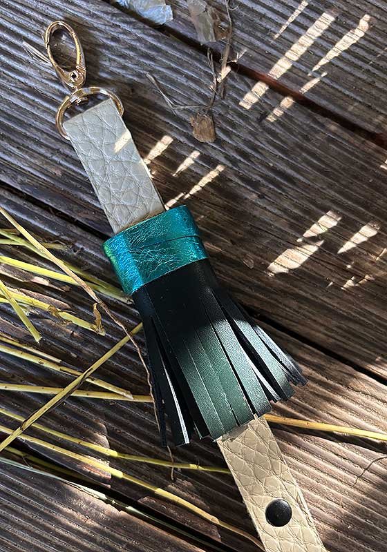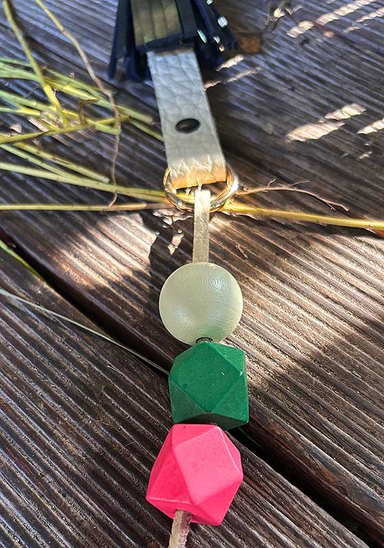 Raktų pakabukas sukurtas derinant skirtingos faktūros, kietumo ir spalvų odos atraižas. Pakabukas sukurtas rankomis ir vienintelis toks. Komponavimui buvo naudotos odos detalės, likusios nuo kitų įmonių gaminių, stengiantis pagarbiai sunaudoti net smulkiausius likučius. Todėl pakartoti raktų pakabuką būna neįmanoma, kiekvienas supjaustytas rankomis ir sudėliotas pagal detalių skambėjimą, kurį pačios ir padiktuoja. Karoliai pagaminti iš medžio, skirtingų spalvų ir formų. Raktai su mūsų karoliais neabejotinai bus laimingi ir pabrėš Jūsų stilių.